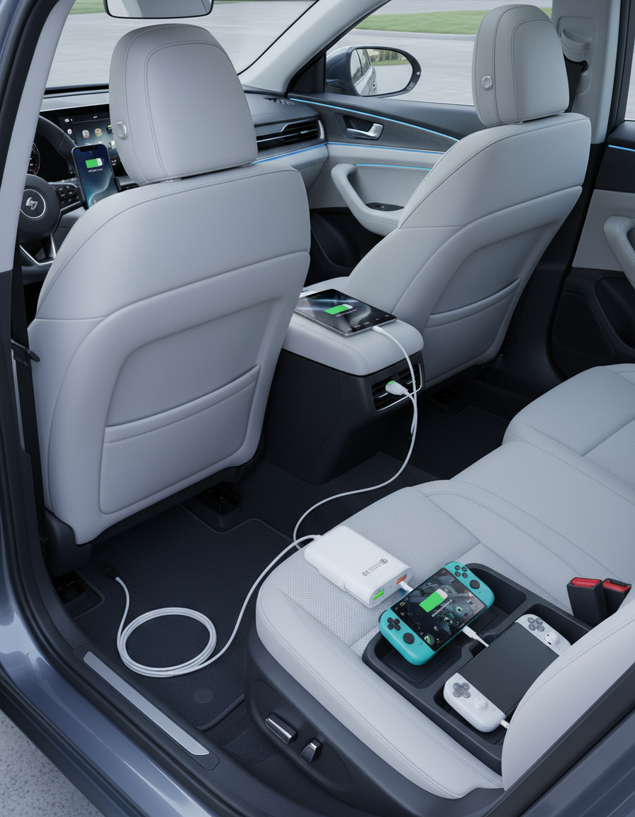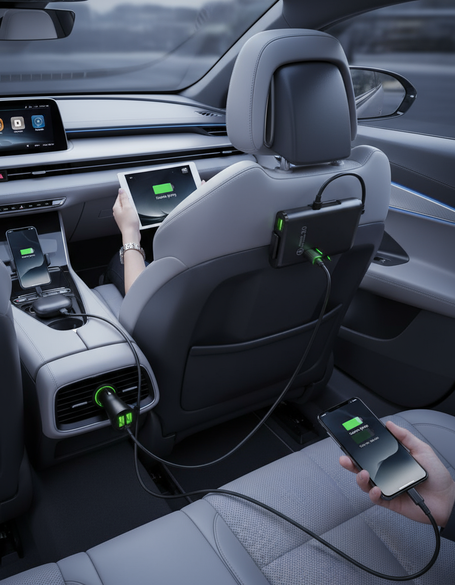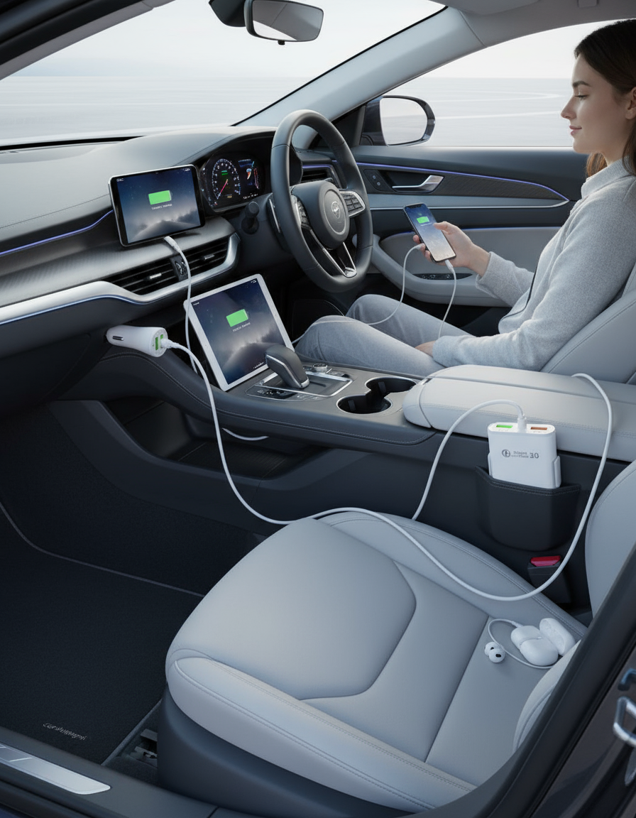 【Incarcare cu mai multe porturi】 Incarcator rapid de masina echipat cu 4 porturi USB, 2 pentru scaunul din fata (2 * 2.4A USB A port) si 2 pentru bancheta din spate (QC3.0 USB A port + 3.1A USB A port). Cu un cablu de incarcare de 1,7 m, permite pasagerilor din fata si din spate sa isi incarce simultan dispozitivele electronice cu usurinta.